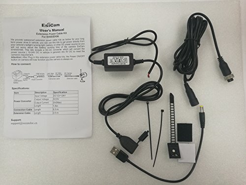 This extension power kits will work with EsiCam EH05/06 Portable Wireless backup camera Camping camera for RV Trailer Hitch .This is waterproof extension power cable kits for your long term power drive in vehicle, you can use this p[]\kits to get power directly from your vehicle's taillight ,running light ,battery, or other DC power source so you will not worry about the built in battery working time of the camera EsiCam EH05/EH06. This kits include a DC-DC converter which will convert the power source ( 12-24V DC in vehicle in general) into 5V DC to meet the camera's requirement.